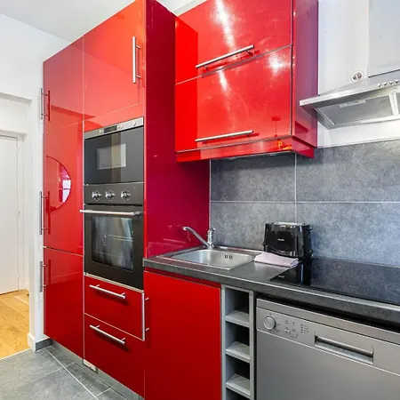 Among the self-catering amenities provided is a fully furnished kitchen with an electric kettle, a fridge, and a kitchenware. The apartment is located about 5 minutes by foot from Porte de Clignancourt subway station.